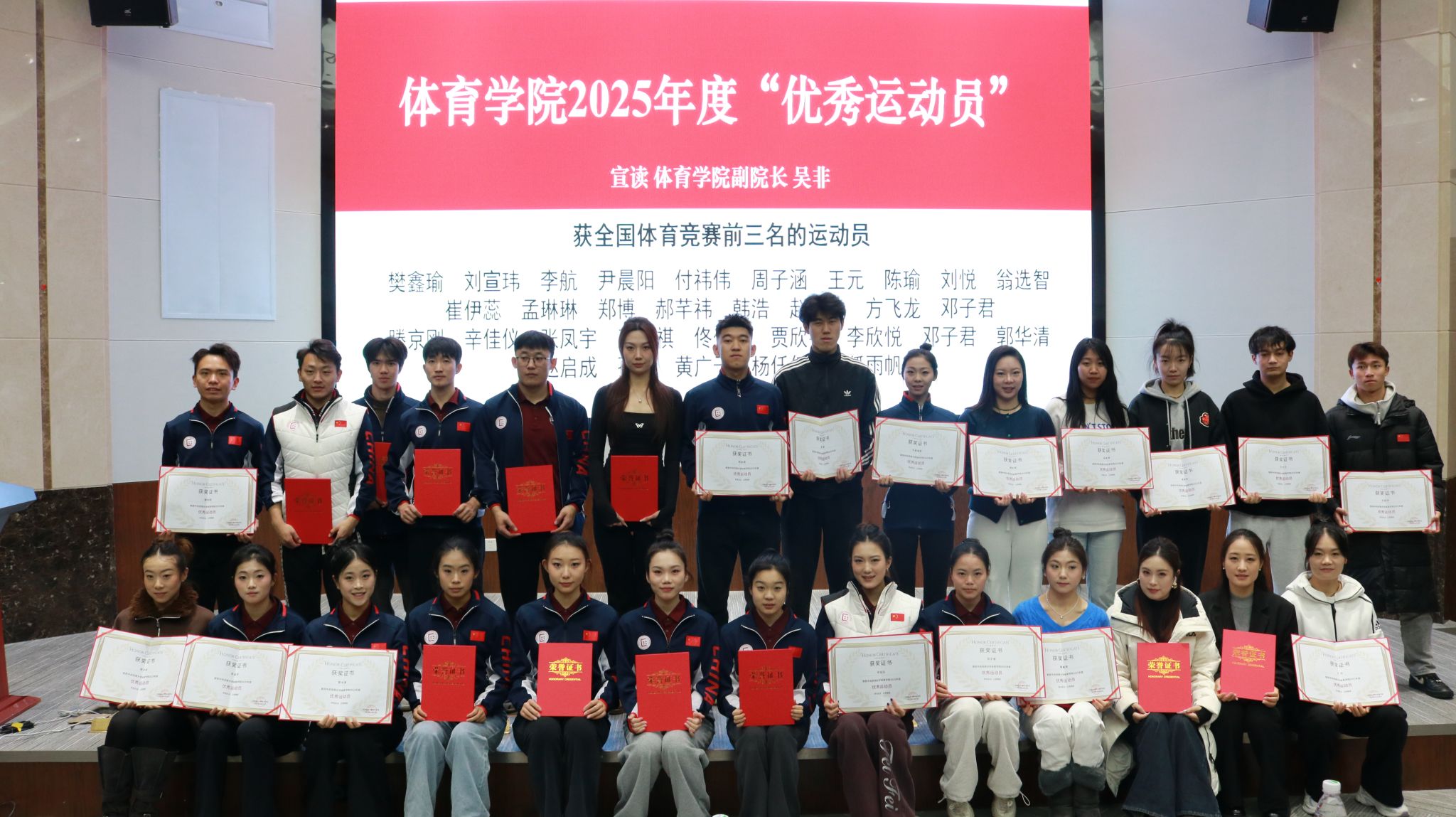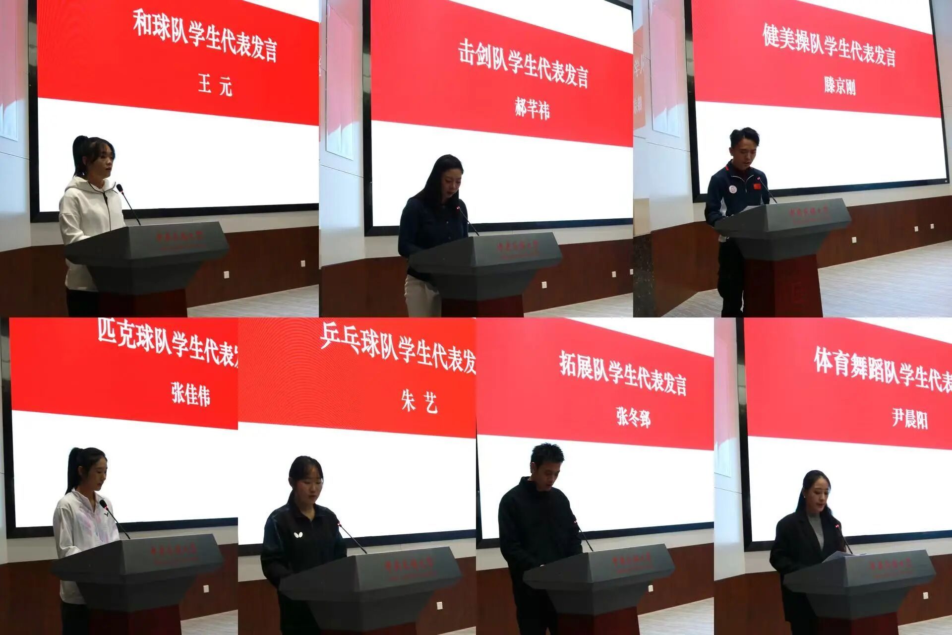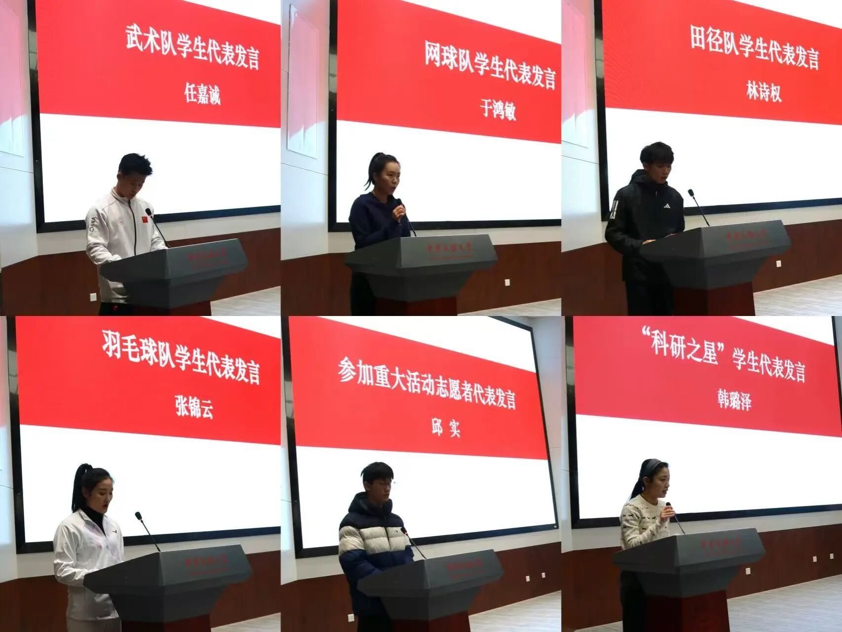 表彰结束后,各运动队学生代表依次进行了发言。王元、滕京刚、张冬郅、尹晨阳、朱艺等11名代表,结合自身训练、学习经历,分享了在竞技体育、学术科研和社会实践中的收获与感悟,诠释“体育强则中国强”的深刻内涵,展现体育学子拼搏进取、全面发展的良好风貌。随后,“科研之星”学生代表韩璐泽,“优秀志愿者”学生代表邱实分别进行发言交流。韩璐泽围绕自身研究生期间的经历,与在座同学分享了自己的感受和心得,她鼓励同学们不懂就问、保持耐心,积极借助各类平台,促进自我成长。邱实分享了参与“九三”阅兵及全运会志愿者的工作经历,号召青年体育人以强健体魄、坚定信念,在民族复兴征程中挺膺向前。